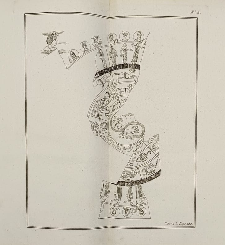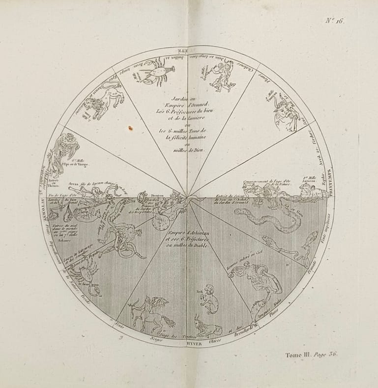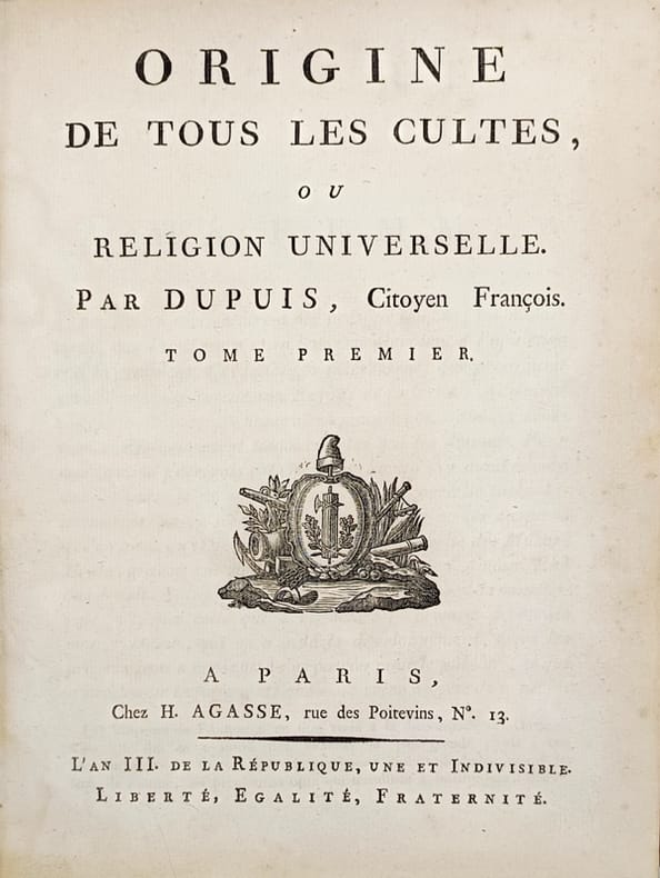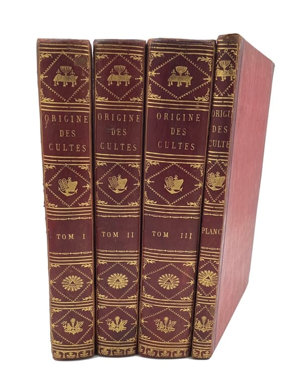 Édition originale rare.Elle se déclinait en deux formats : tous les volumes en in-4 (notre exemplaire) ; ou sept tomes in-8 (souvent distribués en douze volumes), avec un volume in-4 pour les planches. Monglond ne signale d'ailleurs que cette dernière version. Il faut dire que, sous cette forme complète, le livre fut peu lu, mais surtout connu par les contemporains à partir de l'Abrégé, donné par Dupuis lui-même en 1798, et dont il existe de nombreuses rééditions. Le texte intégral fut néanmoins repris en 1834-1837 en dix volumes, en dépit d'une mise à l'Index (au demeurant tardive, en 1818).I. xvj pp., 556 pp., texte sur deux colonnes. - II. [2] ff. n. ch., [292] pp. mal chiffrées 302 (il y a saut de chiffrage de 280 à 291 à la sign. Nn), 304 pp. - III. [2] ff. n. ch., iv pp., pp. 5-367, avec 3 tableaux dépliants hors texte, petit manque de papier au f. 291-92, avec perte de lettre, 355 pp. [Tableau des signes du zodiaque], 104 pp. de table générale des matières, iv pp. de table générale des chapitres. - IV. Planches de l'Origine de tous les cultes, avec leur explication : 16 pp. de texte et 22 planches à double page, montées sur onglets, manque le frontispice.L'ouvrage, qui témoigne d'une prodigieuse érudition, est l'oeuvre de toute une vie (il fut commencé en 1775), et c'est d'ailleurs à cause de lui que l'on retient généralement le nom de Charles-François Dupuis (1742-1809). Il ne méritait nullement les dédains ou les sarcasmes de nombre de contemporains, en dépit de la naïveté indéniable de beaucoup de ses propositions ; il forme en effet la première tentative globale d'étiologie religieuse, et nombre de ses interprétations ont reçu confirmation des travaux récents d'anthropologie religieuse. Son côté systématique (pour Dupuis, toutes les religions transposent en doctrines des mythes ou des faits astronomiques) lui a certes nui, mais ce fut le tout premier essai à prendre le fait religieux comme un objet d'études neutre, susceptible de toutes les interprétations rationnelles envisageables. En même temps, c'est le premier travail de religion comparée, en raison des matériaux empruntés à tous les cultes connus qui servent de socle à la démonstration, sans que soit privilégié le christianisme par rapport aux autres. Bien évidemment, des positions comme "le mot Dieu paraît destiné à exprimer l'idée de la force universelle et éternellement active, qui imprime le mouvement à toute la nature" ou "le christianisme a le caractère du Dieu soleil, adoré chez tous les peuples sous une foule de noms et avec des attributs différens" ne pouvaient que chagriner bien des esprits ; depuis, on en a lu d'autres, et cela paraît bien anodin.Monglond III, 536-538. - - VENTE PAR CORRESPONDANCE UNIQUEMENT