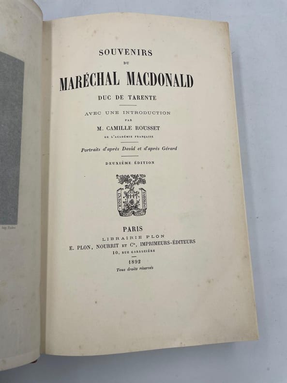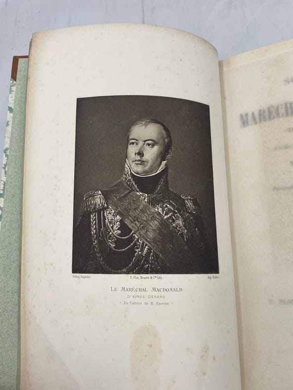Étienne Jacques Joseph Alexandre Macdonald, 1er duc de Tarente, né le 17 novembre 1765 à Sedan (Ardennes) et mort le 25 septembre 1840 dans son château de Courcelles-le-Roy, à Beaulieu-sur-Loire (Loiret), est un général français de la Révolution et un maréchal d'Empire. Merci de nous contacter à l'avance si vous souhaitez consulter une référence au sein de notre librairie.