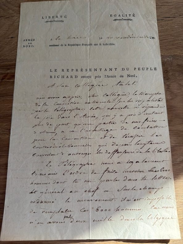 Sur la répression du mouvement du 13 vendémiaire an IV [5 octobre 1795] : "Nous avons appris, cher collègüe, le triomphe de la Convention nationale sur les roÿalistes par le télégraphe. Cette nouvelle a répandu la joïe dans l'armée, qui ÿ a pris d'auatnt plus de part qu'une partie de nos frères d'armes a eu l'avantage de combattre pour la Convention et de terrasser les contre-révolutionnaires qui depuis longtemps couvroient d'outrages les deffenseurs de la liberté".Joseph-Étienne Richard (1765-1839) avait été élu député de la Sarthe à l'Assemblée législative puis à la Convention ; il fut envoyé en mission avec Choudieu dans le Maine puis à l'Armée du Nord, s'occupa de l'administration des pays conquis et se montra très clément auprès des prisonniers émigrés et anglais, ce dont la Restauration se souviendra. Réélu dans le département du Nord, il siégea au Conseil des Cinq-Cents jusqu'en 1797, devint adjoint au chef de la 8e division au ministère de la Guerre. Après le coup d'état du 18 Brumaire, il se fit nommer préfet de la Haute-Garonne et deviendra préfet de la Charente-Inférieure en 1806.Cette lettre est d'autant plus intéressante que son correspondant, Michel-Louis Talot (1755-1828), alors envoyé dans le Pas-de-Calais pour y réorganiser les administrations, devait prendre la défense devant le conseil de guerre, à son retour à Paris, du général Menou, son ancien compagnon d'armes, mis en jugement pour son comportement lors de cette insurrection royaliste du 13 vendémiaire an IV ; il réussit à obtenir son acquittement. - - VENTE PAR CORRESPONDANCE UNIQUEMENT - LIEN DE PAIEMENT, NOUS CONSULTER.