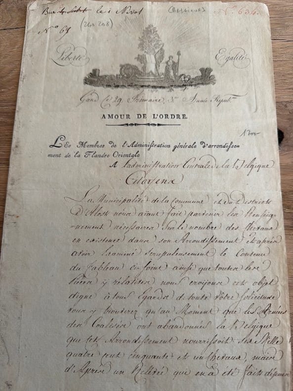 Gand, 29 Frimaire an III (19 décembre 1794) in-folio, [3] pp. n. ch., couvertes d'une écriture moyenne, régulière et très lisible, avec une vignette en-tête gravée, en feuille.