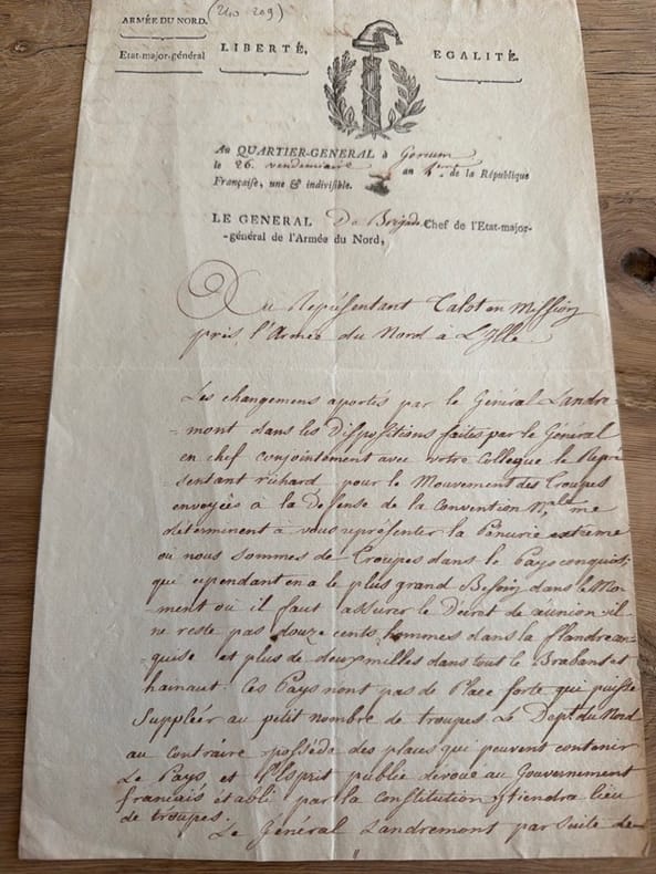 Très intéressante missive qui expose les conséquences sur les effectifs de l'Armée du Nord du détachement de soldats destinés à défendre la Convention après l'insurrection du 13 vendémiaire an IV [5 octobre 1795], et demande le secours du département du Nord : "Les changemens aportés par le général Landremont dans les dispositions faites par le général en chef conjointement avec votre collègue le représentant Richard pour le mouvement des troupes envoyées à la défense de la Convention nationale me déterminent à vous représenter la pénurie extrême où nous sommes de troupes dans le pays conquis ; qui cependant en a le plus grand besoin dans le moment où il faut assurer le décret de réunion. Il ne reste pas douze cents hommes dans la Flandre conquise et plus de deux mille dans tout le Brabant et Hainaut. Ces pays n'ont pas de place forte qui puisse suppléer au petit nombre des troupes".Son destinataire, Michel-Louis Talot (1755-1828), était alors envoyé en mission près l'Armée de Sambre-et-Meuse. - - VENTE PAR CORRESPONDANCE UNIQUEMENT - LIEN DE PAIEMENT, NOUS CONSULTER.