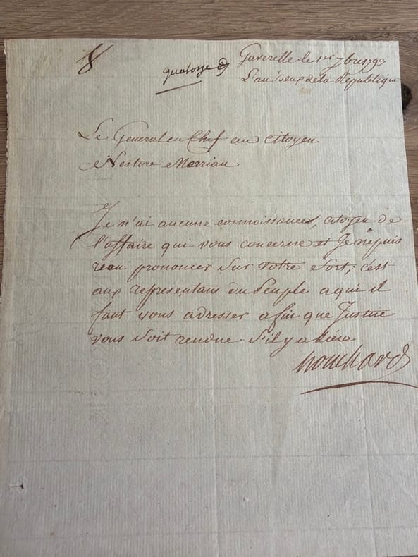 Brève missive, adressée à un certain Nestor Merriau, au contenu aussi énigmatique pour nous que son objet était inconnu de Houchard : "Je n'ai aucune connoissance, citoyen, de l'affaire qui vous concerne et je ne puis me prononcer sur votre sort ; c'est aux représentans du peuple à qui il faut vous adresser afin que justice vous soit rendue s'il y a lieu".En tout cas, elle précède de peu l'arrestation du général Jean-Nicolas Houchard (1738-1793), le 24 du même mois, sur l'accusation de ne pas avoir tiré parti de la victoire de Hondschoote. - - VENTE PAR CORRESPONDANCE UNIQUEMENT - LIEN DE PAIEMENT, NOUS CONSULTER.