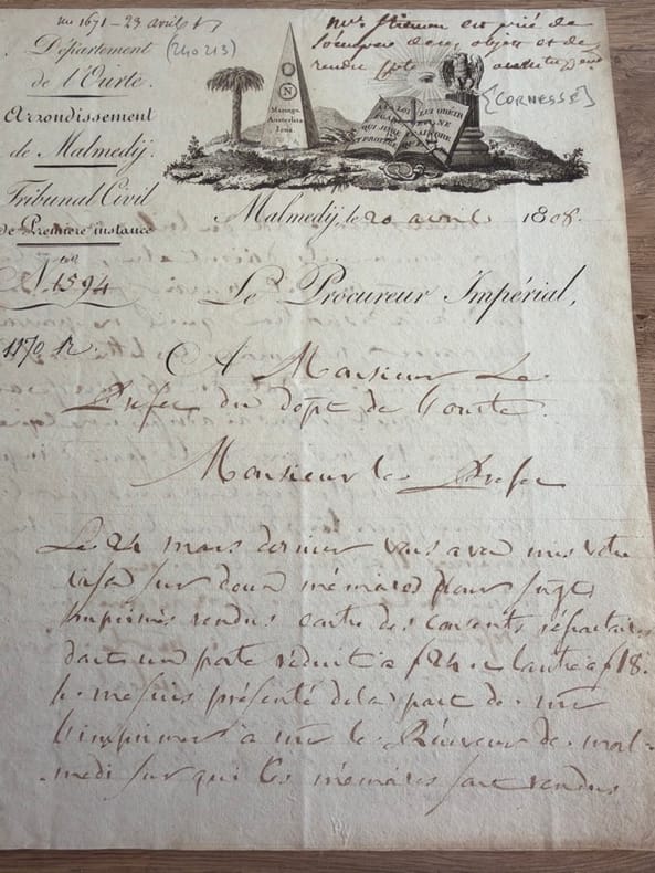 Malmédy, 20 avril 1808 in-4, [3] pp. n. ch., couvertes d'une écriture moyenne et peu lisible, avec une belle vignette en-tête allégorique gravée, en feuille.