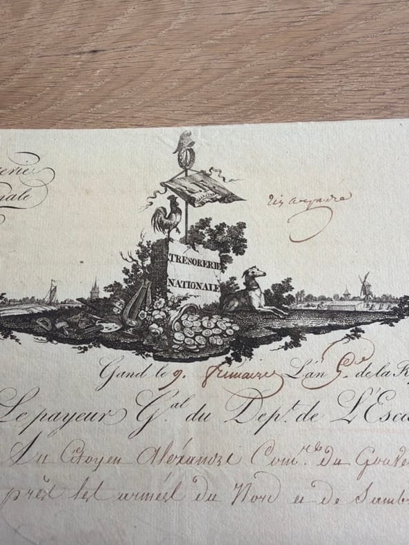 Gand, 9 Frimaire an V (29 novembre 1796) in-8, [2] pp. n. ch., couvertes d'une écriture fine, régulière et très lisible, avec une belle vignette en-tête gravée représentant des paysages typiques du "plat pays", en feuille.