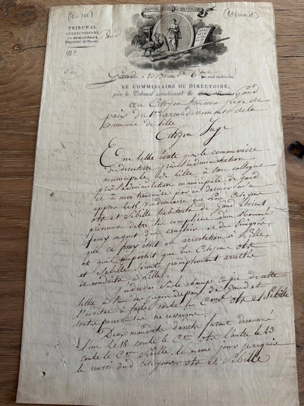 Longue missive explicitant les déboires de Lacoudraye dans l'inculpation de deux gantois pour une affaire de complicité d'espionnage, qu'il désire faire transférer à Lille après leur arrestation (mais le tribunal correctionnel local persiste à se déclarer compétent) : "Une lettre écrite par le commissaire du directoire près l'administration municipale de Lille (...) m'a appris le 15 vendémiaire que les citoyens Oht et Sébille habitants de Gand étoient prévenus d'être les complices d'un nommé Fémy agent des Anglois et des émigrés". - - VENTE PAR CORRESPONDANCE UNIQUEMENT - LIEN DE PAIEMENT, NOUS CONSULTER.