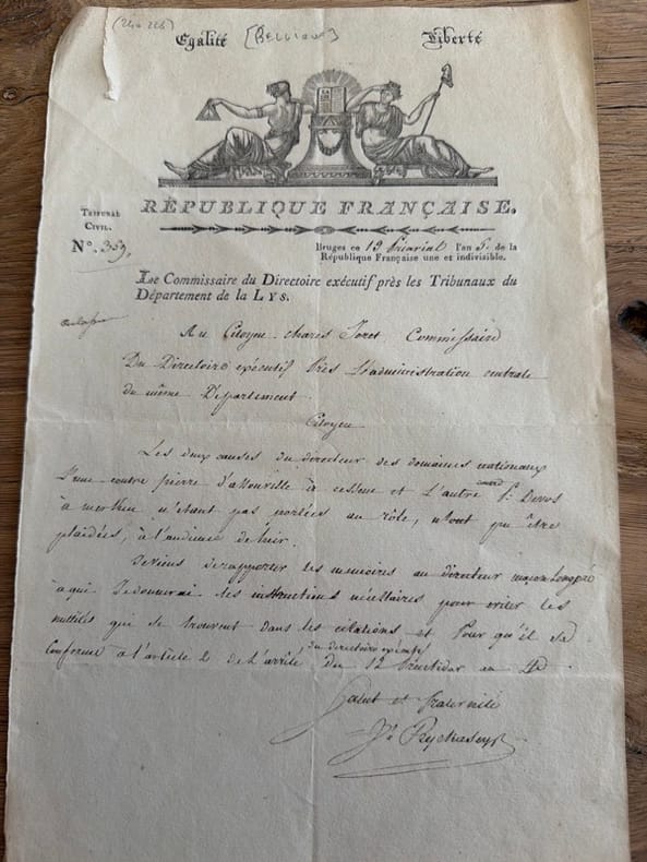 Bruges, 19 Prairial an V (7 juin 1797) in-folio, écrit au recto, avec belle vignette allégorique gravée en-tête, en feuille.