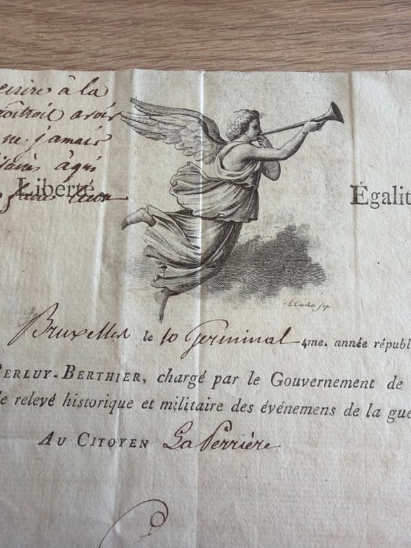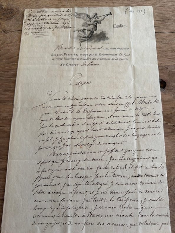 Adressée à la trésorerie du ministère, cette lettre forme une longue plainte sur les difficultés financières de Louis-César-Gabriel Berluy de Berthier (1765-1819), frère cadet du futur maréchal, et alors employé comme ingénieur-géographe, adjudant général chef de brigade et chef du bureau topographique près de l'armée de Sambre-et-Meuse en 1796 : "Mes appointemens ne suffisent pas pour vivre ; il faut que je mange du mien. J'ai des ingénieurs qui ne font pour ainsi dire rien faite de fonds, il fait un tems superbe pour les envoyer sur le terrein ; on me tourmente horriblement ..."Belle vignette gravée montrant un ange sonnant du tocsin. - - VENTE PAR CORRESPONDANCE UNIQUEMENT - LIEN DE PAIEMENT, NOUS CONSULTER.