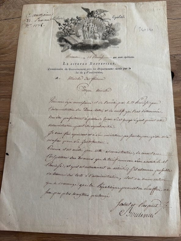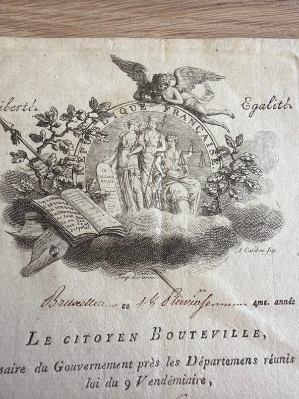 Bruxelles, 14 Pluviôse an IV (3 février 1796) in-folio, écrit au recto, avec une belle vignette emblématique en-tête gravée par A. Cardon, en feuille.