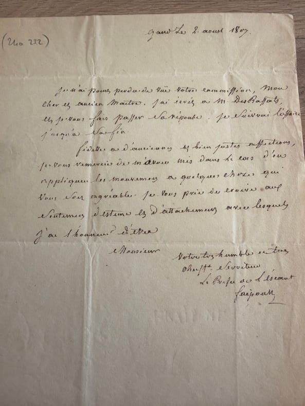 Adressé à Lallemand, professeur du Lycée de Bruxelles, apparemment un ancien maître du signataire, ce petit billet assure le destinataire du suivi d'une affaire le concernant : "Je n'ai point perdu de vuë votre commission, mon cher et ancien maître". Mais on ne sait pas de quoi il s'agit.Ancien ministre des Finances en 1795 puis plénipotentiaire à Gênes, Guillaume-Charles Faipoult, sieur de Maisoncelle, (1752-1817) fut nommé après le 18 Brumaire par Bonaparte qui l'appréciait, député de l'Escaut. Il occupa ce poste jusqu'en 1808, date à laquelle il fut révoqué suite à une rupture des digues de l'Escaut. - - VENTE PAR CORRESPONDANCE UNIQUEMENT - LIEN DE PAIEMENT, NOUS CONSULTER.