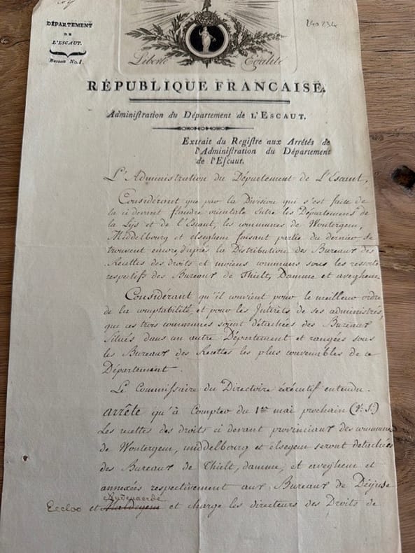 Signé de Hopsomere, président, cet acte transfère les recettes des bureaux de Wontergem, Middelbourg et Elseghem du ressort de Thielt [= Tielt] à celui de Deÿnse [= Deinze]. - - VENTE PAR CORRESPONDANCE UNIQUEMENT - LIEN DE PAIEMENT, NOUS CONSULTER.