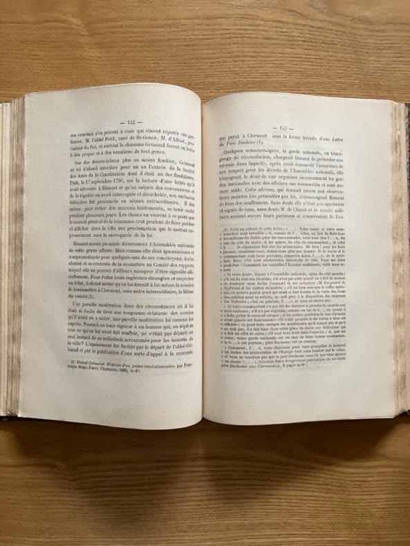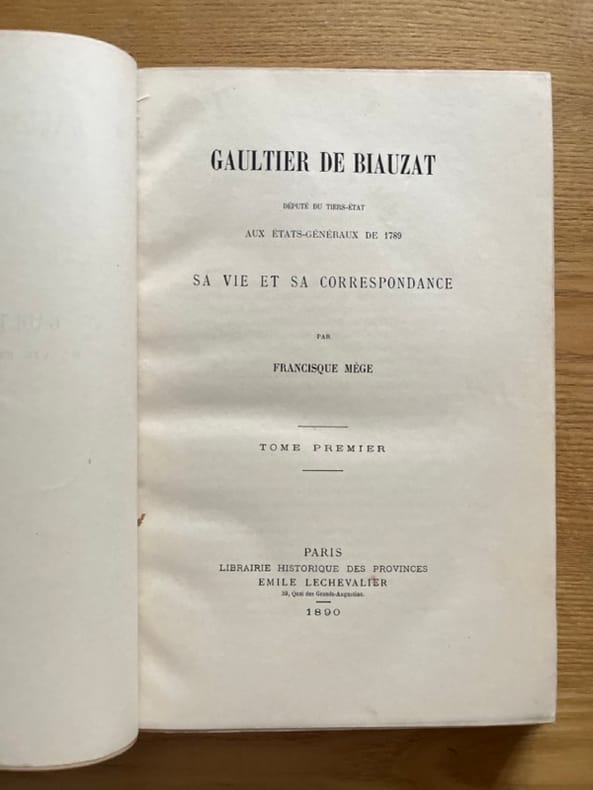 1890 Clermont-Ferrand, Bellet, 1890. 2 volumes in-8 brochés non coupés, VIII-328 et 403 pages. Cette excellente biographie que lon peut assimiler à des mémoires originaux, présentés à travers une correspondance critique, nous révèle Gaultier de Biauzat, avocat, premier maire de Clermont et figure marquante de la Révolution. Bel exemplaire.