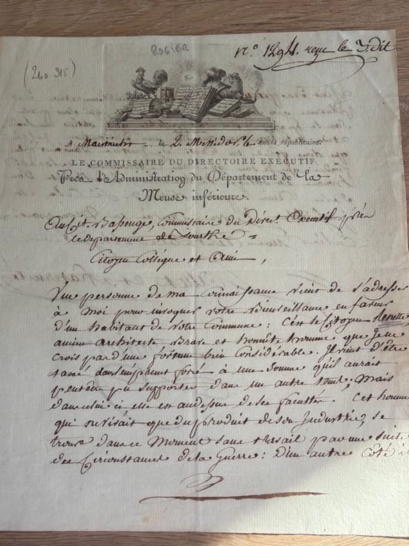 Maastricht, 2 Messidor an IV (20 juin 1796), in-4, écrit sur deux pages, avec belle vignette en-tête, en feuille.