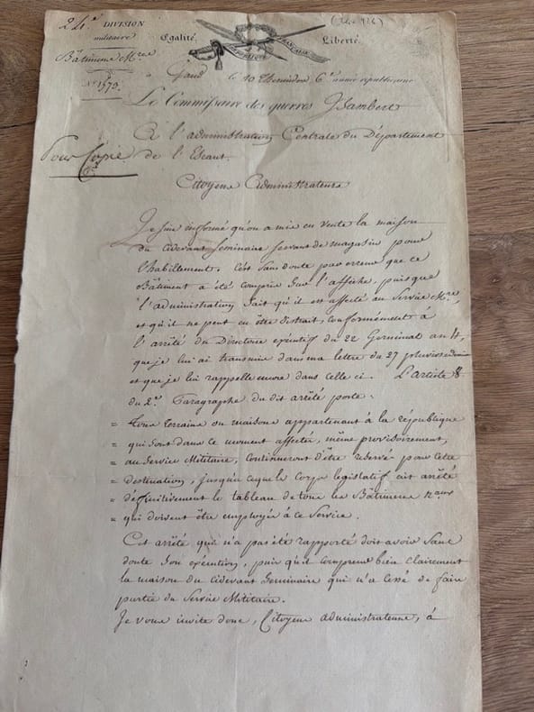 S'oppose à la mise en vente de l'ancien séminaire de Gand, actuellement affecté comme magasin au service de l'habillement, en vertu de l'arrêté du Directoire en date du 22 Germinal an IV [11 avril 1796]. - - VENTE PAR CORRESPONDANCE UNIQUEMENT - LIEN DE PAIEMENT, NOUS CONSULTER.