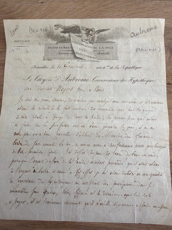 "Je suis très peiné, citoyens, de n'avoir pu malgré tous mes soins et sollicitations obtenir la revente à la folle enchère des immeubles qui sont le gage de votre sédule [sic] (...). Il ne me reste plus qu'à vous conseiller d'obtenir du ministre des finances l'ordre d'exécuter la loi".D'Aubremé, était conservateur des hypothèques et receveur des Domaines des cantons de Bruxelles et Anderlecht, à Bruxelles. - - VENTE PAR CORRESPONDANCE UNIQUEMENT - LIEN DE PAIEMENT, NOUS CONSULTER.
