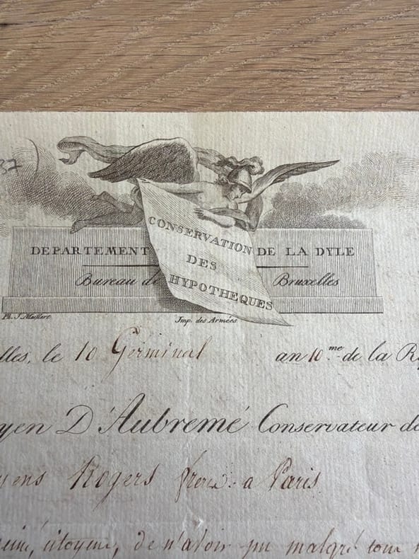 Bruxelles, 10 Germinal an X (31 mars 1802) in-8, avec belle vignette en-tête, en feuille.