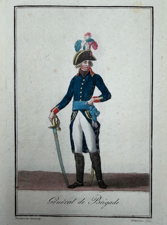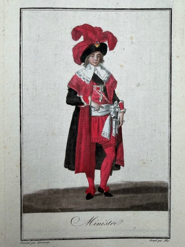 Premier tirage des planches de Garneray.Ces 26 planches ont été gravées à l'eau-forte et à l'aquatinte par Alix d'après les dessins de Garneray, puis mises en coloris à l'époque. Certains exemplaires comportent une page de titre et le texte explicatif des costumes.Garneray dessina cette première suite de 26 costumes qui fut publiée vers 1796. Une nouvelle édition fut faite vers 1798, complétée par une planche de Bonneville (Costume des Membres des deux Conseils) et par trois planches non signées relatives à la marine."L'abbé Grégoire proposa en septembre 1795, au nom du Comité d'Instruction Publique, de distinguer par un costume approprié les députés et les fonctionnaires publics qui, servant la Nation, étaient un peu plus égaux que les autres. Aussi la Convention précisa-t-elle, avant de se dissoudre, les costumes qui devaient être portés sous le Directoire, des directeurs aux juges en passant par les députés aux conseils, les ministres, les huissiers et les magistrats des principales cours" (Histoire et dict. de la Révolution Française, 734).Bel exemplaire relié au XIXe siècle.Trois ex-libris dont M. Van Nieuwenhuyse.Colas, 1181. Coll. Ponti, 119. - - VENTE PAR CORRESPONDANCE UNIQUEMENT - LIEN DE PAIEMENT, NOUS CONSULTER.