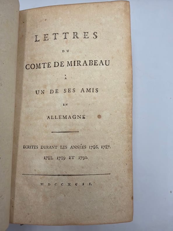 Édition originale rare. C'est le destinataire lui-même, l'ingénieur militaire Jacob von Mauvillon (1743-1794), qui assura la publication de cette correspondance, laquelle avait débuté lors du séjour berlinois de Mirabeau du 5 juillet 1786 au 19 janvier 1787. Rappelons que c'est Mauvillon le principal auteur du Tableau de la monarchie prussienne sous Frédéric II, publié en 1788 sous le seul nom de Mirabeau.Au CCF, exemplaires à la BnF, Strasbourg, Nantes et Poitiers seulement. - - VENTE PAR CORRESPONDANCE UNIQUEMENT - LIEN DE PAIEMENT, NOUS CONSULTER.