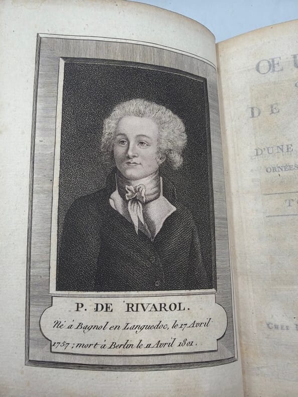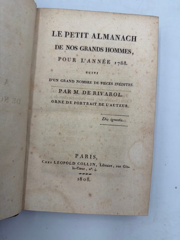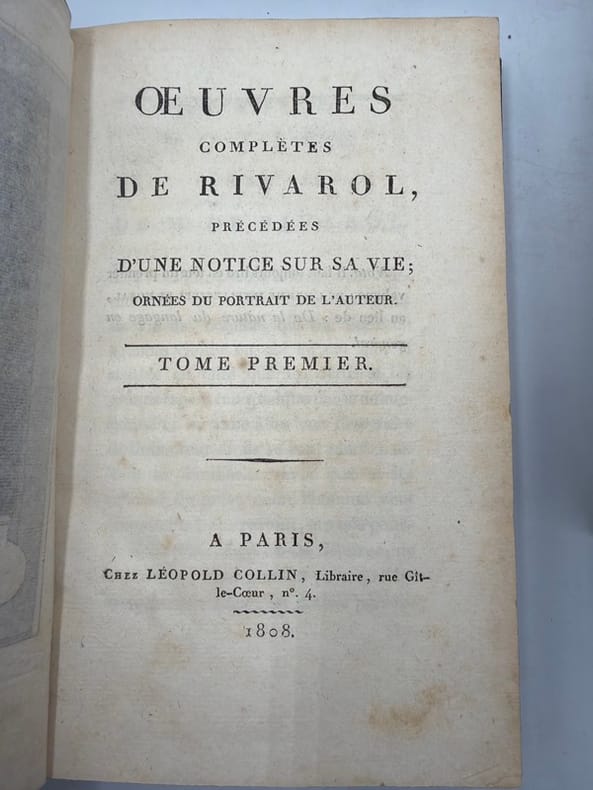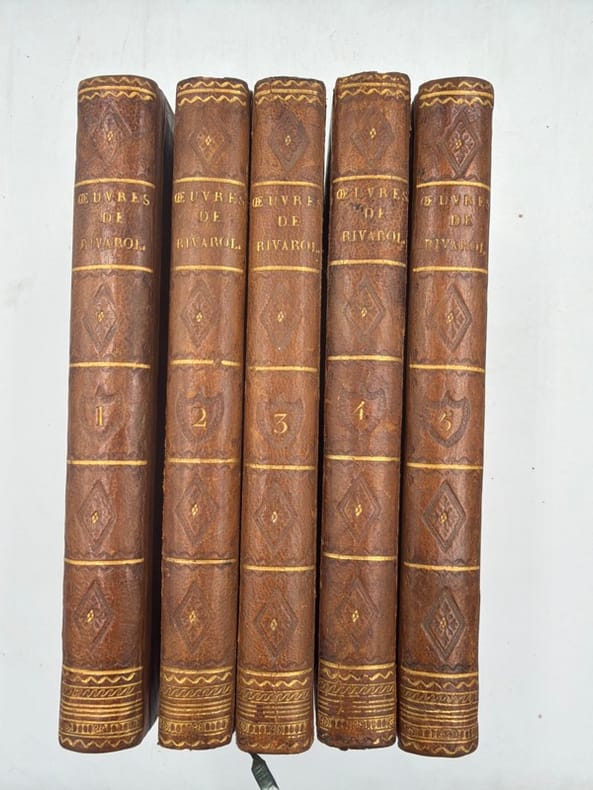 Edition de référence, procurée par Chênedollé et Fayolle, la première collective des oeuvres du journaliste contre-révolutionnaire. Elle ne comprend pas absolument toutes les pièces qui circulaient alors (Fayolle en avait gardé un certain nombre par devers lui, destinées à former un sixième volume), mais reprend l'essentiel des textes.Le tome V n'a pas la page de titre des Œuvres. Il a pour titre Le Petit Almanach de nos grands hommes pour 1788.Cioranescu, XVIII, 53235. Bon exemplaire. Ex-libris G. H. - - VENTE PAR CORRESPONDANCE UNIQUEMENT - LIEN DE PAIEMENT, NOUS CONSULTER.