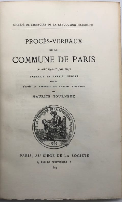 Paris Au Siège de la Société de l'Histoire de la Révolution Française 1894 grand in 8 (25,5x16,5) 1 volume reliure demi chagrin marron, dos à nerfs, pièce de titre de cuir noir, VIII et 203 pages. Exemplaire imprimé sur papier vergé d'Arches. Reliure XXe. Ex-libris R. V. F. Publié par la Société de l'Histoire de la Révolution Française. Maurice Tourneux, 1849-1917. Bel exemplaire, exempt de rousseurs ( Photographies sur demande / We can send pictures of this book on simple request )