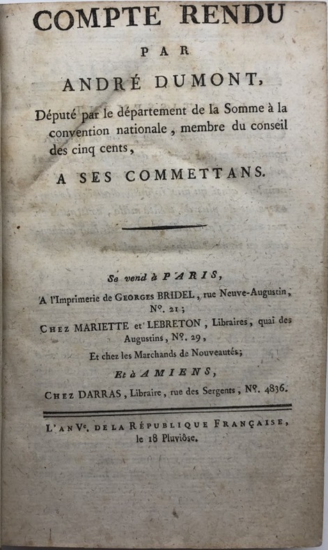 Suivi de :- Barbier-Jenty : Réponse à André Dumont, sur son compte rendu à ses commettans. Amiens, Caron-Berquier, An V, (1797), 123 pp. - - VENTE PAR CORRESPONDANCE UNIQUEMENT