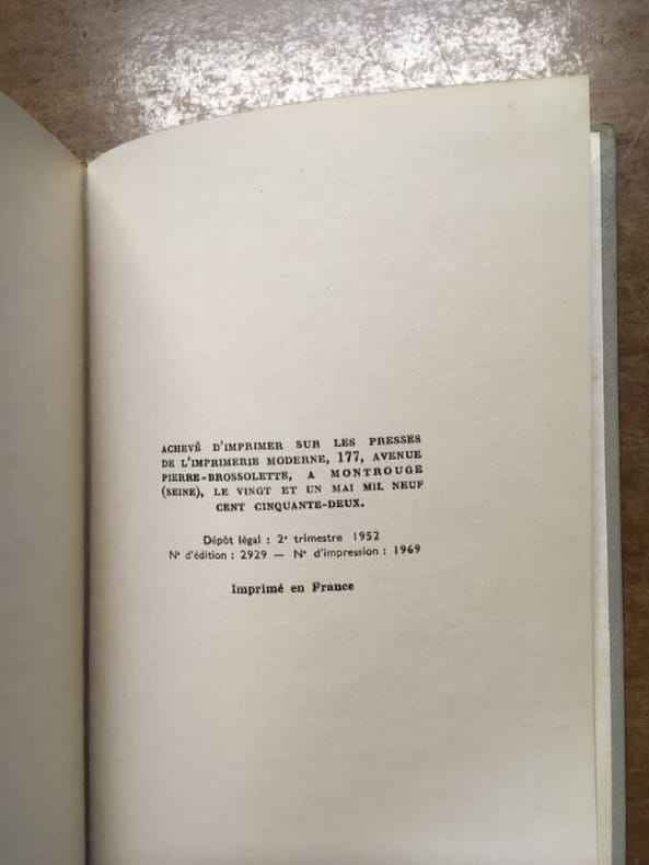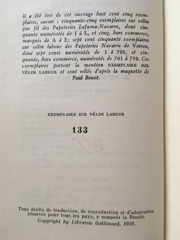 Nrf Gallimard 1952 1 In-Douze Relié Cartonnage de l'éditeur d'après la maquette de Paul Bonet. Edition originale Nrf Gallimard de 1952. Exemplaire numéroté sur vélin Labeur. 212 pp. Très bon état : frottements infimes, très discrets ; à peine quelques légères petites rousseurs. Un très bel exemplaire. Photos sur demande. [Authon table]