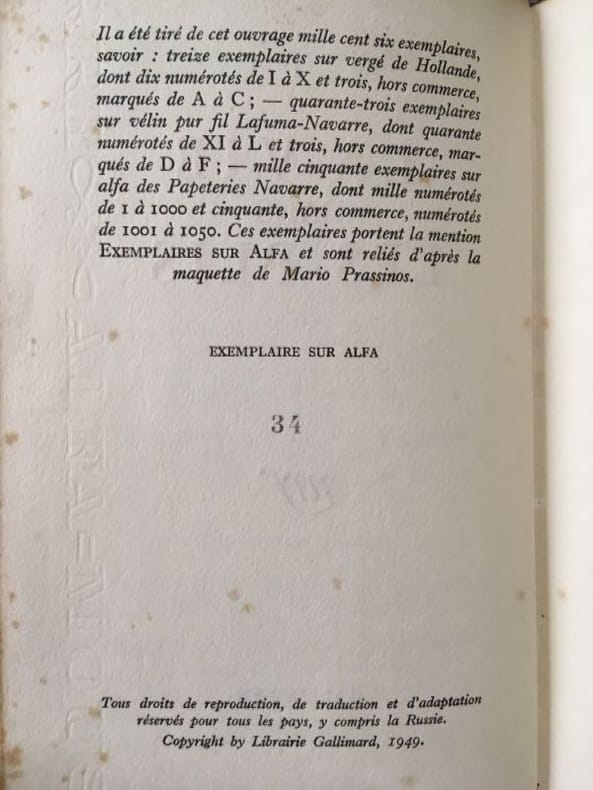 Gallimard Paris 1949 1 vol. In-12 de 247 pp., cartonnage éditeur d'après la maquette de Mario Prassinos.