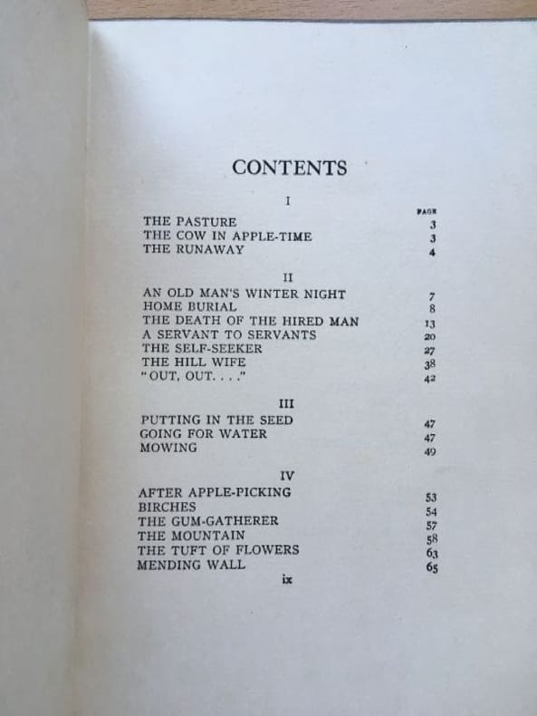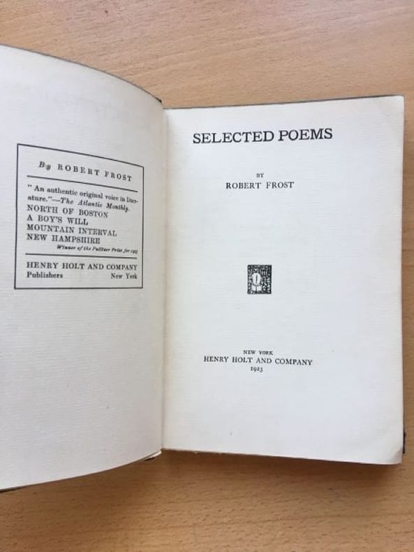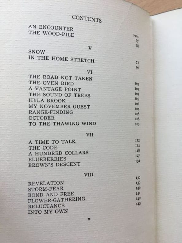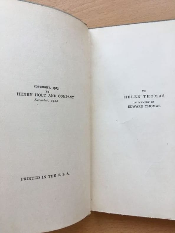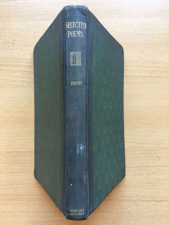 1924 Cartonnage de l'éditeur, dos percaline noire, lettres et décor doré, plats verts ornés de couronnes de laurier dorées. Etat d'usage, correct. Couverture défraîchie, coins fortement usés. Un nom à la plume sur la page de garde. Contenu propre. Edition Henry Holt and Company, New York, December 1924. "The poems included in this volume are reprinted from "Mountain Interval", "North of Boston", and "A Boy's Will"." Photos sur demande.