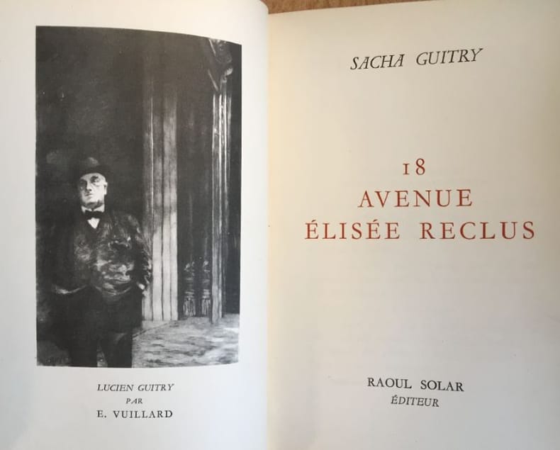 Raoul Solar, in-8, broché, 110 pp., couverture illustrée et rempilée planche en frontispice : Lucien Guitry par E. Vuillard et en fin de volume 9 planches hors-texte : 4 portraits d'hommes et cinq portraits de fleurs. Edition originale. Reproductions des tableaux et manuscrits ayant appartenu à Sacha Guitry. au " 18 Avenue Elisée Reclus".
