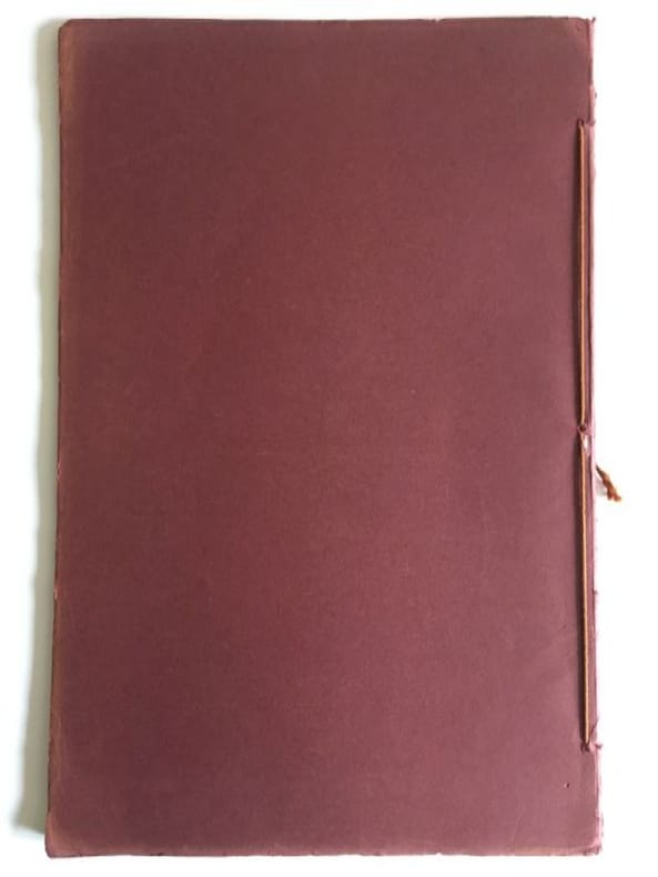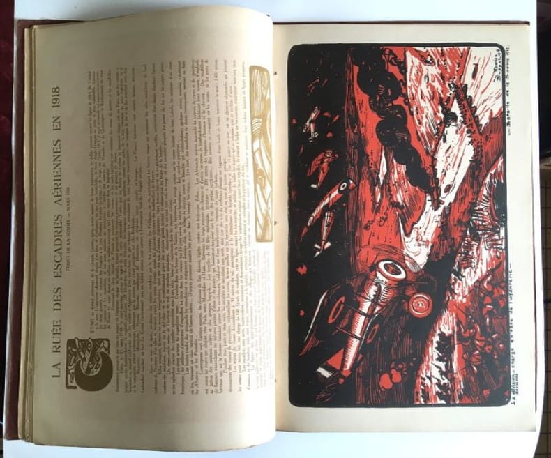 1919 Librairie Delagrave, Paris, 1919. Rare album in-plano (50 x 32,5 cm) de 50 pages. Feuilles sous couverture souple imprimée, reliées par un cordon, sous chemise imprimée à l'identique de la couverture.24 estampes pleine page, gravées sur bois, en bichromie (jaune, rouge ou bleu). Les estampes sont accompagnées chacune d'un texte thématique au verso. Toutes les compositions typographiques et décoratives sont de l'artiste. Assez bon état général. Planches en bel état, malgré quelques légers froissements marginaux. Quelques légères petites rousseurs sur la première et la dernière page, déchirure au bord supérieur de la page de titre. Couverture en état d'usage, marquée d'un grand pli au recto et de déchirures au dos, notamment au niveau des points d'attache du cordon. Chemise abîmée, plis et nombreuses déchirures. Photos et précisions supplémentaires sur demande.