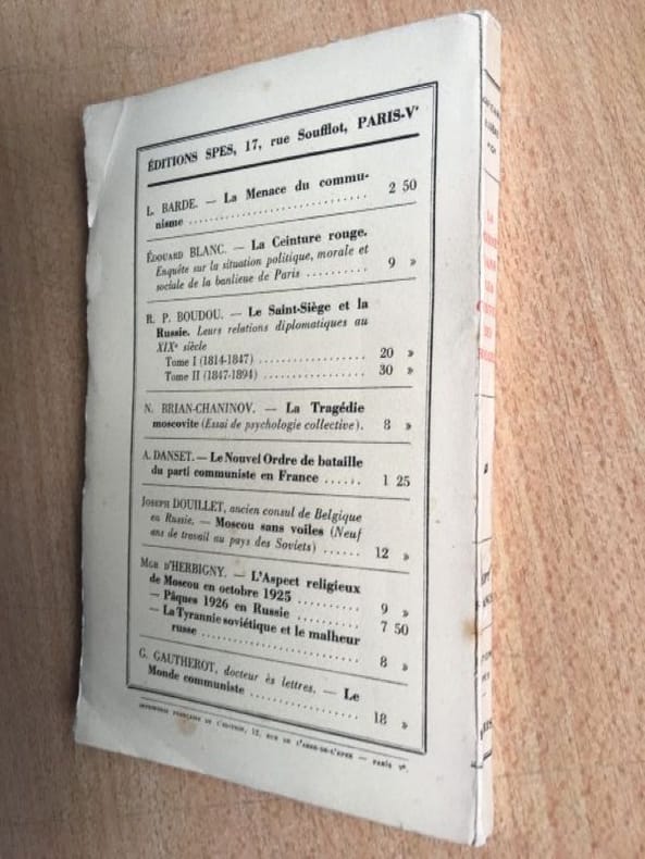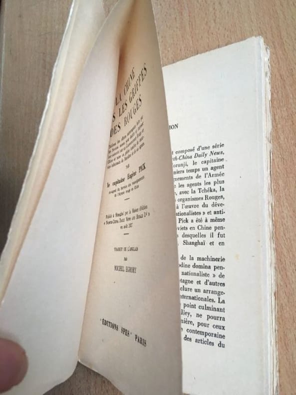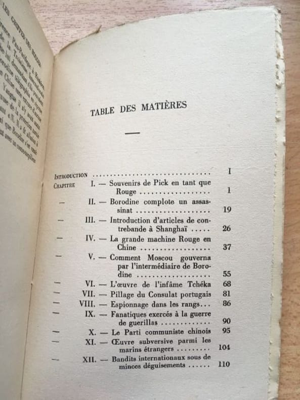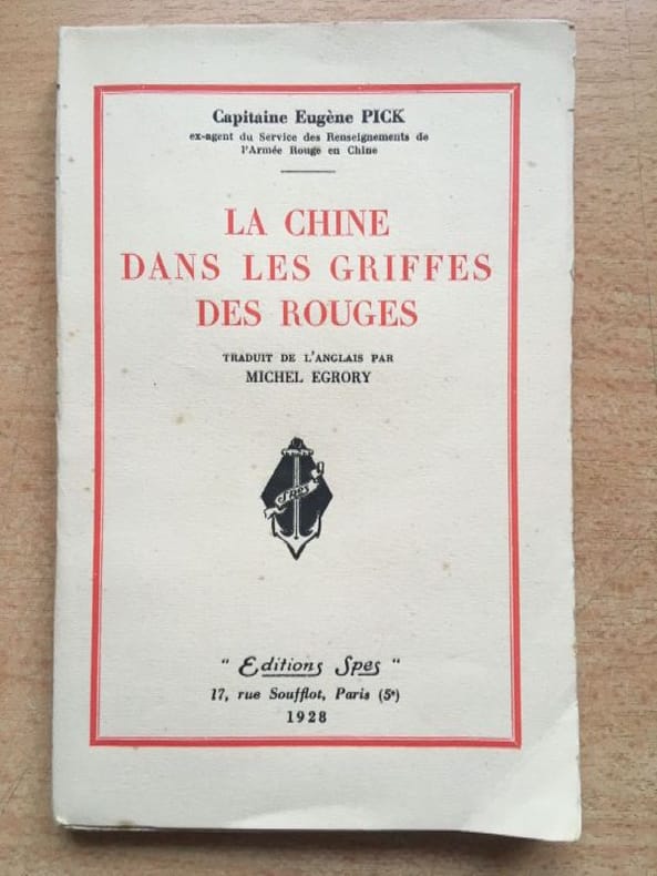 "Tableau des efforts extravagants faits par les Soviets russes pour établir et imposer leur autorité sur un Gouvernement Rouge en Chine et mise en pleine lumière du caractère inhumain de Borodine et de ses agents". Par le Capitaine Eugène PICK, ex-agent du service des renseignements de l'Armée rouge en Chine. Publié à Shanghai par la maison d'édition North China Daily News and Herald Ltd en août 1927. Merci de nous contacter à l'avance si vous souhaitez consulter une référence dans notre boutique à Authon-du-Perche.