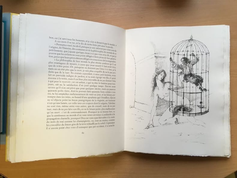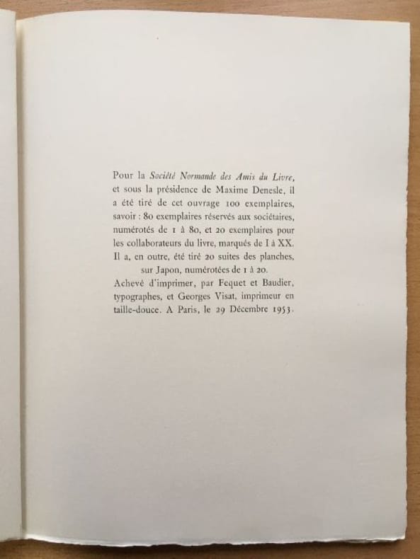 1953 Grand in-4 en feuillets, sous couverture blanche rempliée, chemise cartonnée jaune et étui du même jaune. Le texte est illustré de 26 gravures sur cuivre de Stanislas Lepri dont un frontispice et 7 hors-texte. Un des 80 exemplaires réservés aux membres de la Société normande des Amis du Livre. Tirage à 100 exemplaires. 1953. Bon état. L'étui et la chemise sont défraîchis, le papier présente quelques rousseurs. L'intérieur est dans l'ensemble très propre. Photo sur demande.