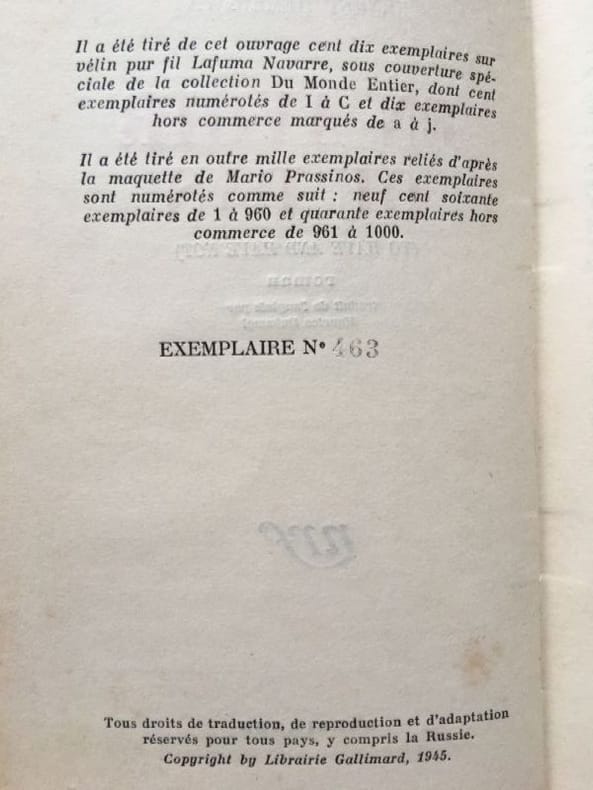 1945 In-Douze Relié Cartonnage de l'éditeur d'après la maquette de Mario Prassinos. Edition originale Nrf Gallimard de 1945. Exemplaire numéroté. In-12. 256 pp. Bon état. Couverture défraîchie, légers frottements et petites salissures d'usage, enfoncements sur le bord supérieur de la couverture. Tranches légèrement piquées. Contenu propre. Photos sur demande.