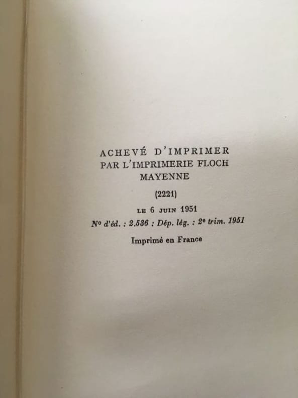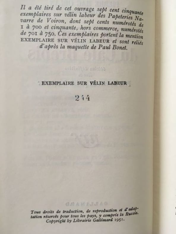 1951 In-Douze Relié Cartonnage de l'éditeur décoré en couleurs sur la maquette de Paul Bonet. Édition originale Nrf Gallimard de 1951. Exemplaire numéroté sur vélin Labeur. In-12. 245 pp. Bon état : légers frottements discrets, notamment à la coiffe et au pied ; tranche de tête piquée. Déchirure de surface très fine au bas du mors verso. Aspect d'ensemble très satisfaisant, intérieur propre. Photos sur demande.
