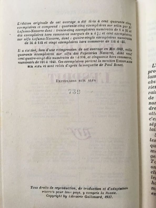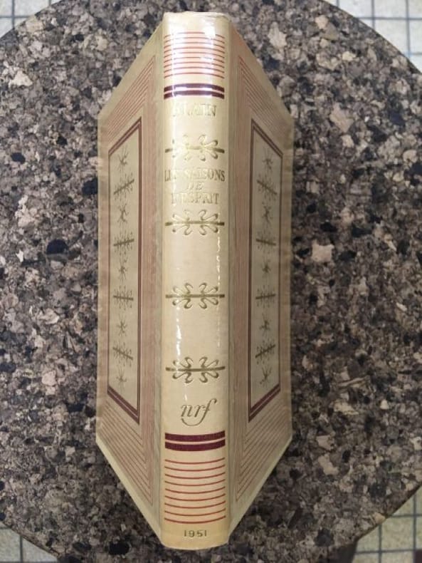 Nrf Gallimard 1951 In-Douze Relié Cartonnage de l'éditeur d'après la maquette de Paul Bonet. Edition Nrf Gallimard de 1949, cartonnage de 1951, daté en queue du dos. Exemplaire numéroté sur Alfa. In-12. 211 pp. Bon état. Dos à peine jauni, très léger enfoncement à la coiffe, frottements infimes au en queue, quelques petites rousseurs habituelles aux tranches. Contenu propre, état d'ensemble très satisfaisant. Photos sur demande.