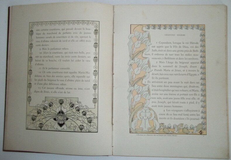 Imprimerie Draeger, sans date, fin 19e. Evangelium Infantice N. H. J. C. selon Saint Pierre d’après le Manuscrit de Labraye de Saint Wolfgang. Ouvrage illustré de compositions et encadrements en couleurs de Carloz Schwabe dans un style art nouveau. Un ex-libris de Pierre Besnard sur la page de garde