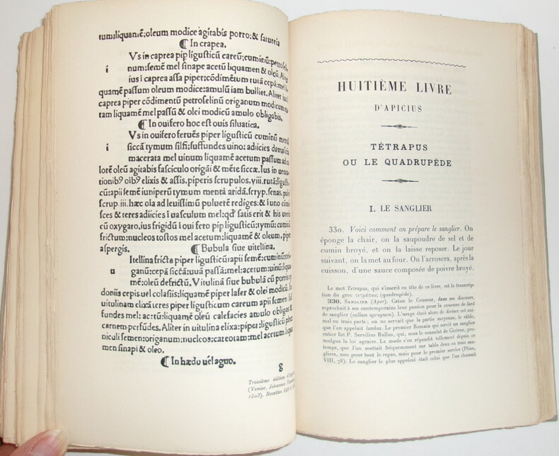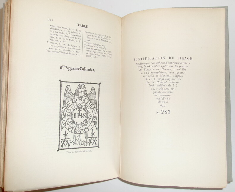 Paris, René Bonnel, 1933, in-8, LXXVIII-322 pp, Broché, couverture grise rempliée, Un des 650 exemplaires sur vélin de Vidalon (n° 129). Édition originale de la traduction française, par Bertrand Guégan (1892-1943), de "l'ancêtre de tous les livres de cuisine" (Oberlé). Couverture défraîchie. Oberlé, Fastes n° 7. Couverture rigide