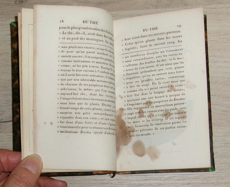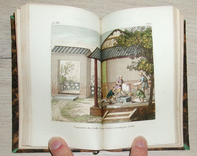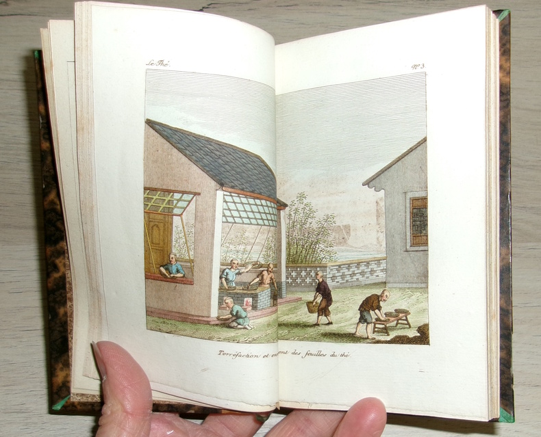 Chez les libraires Nepveu, Audot et Marquis, 1820. Avec 10 gravures coloriées, faite d’après nature et d’après des peintures originales de la Chine dont 6 en double page. La culture du thé, sa récolte, sa préparation et ses usages. Petit ouvrage plutôt rare, reliure dos cuir décoré, avec un ex-libris de M. de Vergès.