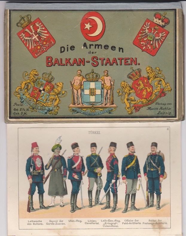 Leipzig, Verlag von Moritz Ruhl. Die Armeen der Balkan-Staaten (Türkei - Griechenland - Rumänien - Serbien - Bulgarien - Montenegro) in ihren gegenwärtigen Uniformirungen, dargestellt in 64 in Frabendruck ausgeführten Abbildungen. Nebst Erläuterungen und Mittheilungen über Organisation, Eintheilung und Stärke dieser Armeen. 10 planches de chromo. représentant 64 uniformes en couleurs des armées des pays des Balkans (Turquie - Grèce - Roumanie - Serbie - Bulgarie - Monténégro), plus les notes et les communications sur l'organisation, la division et la force de ces armées (fin XIXe siècle).