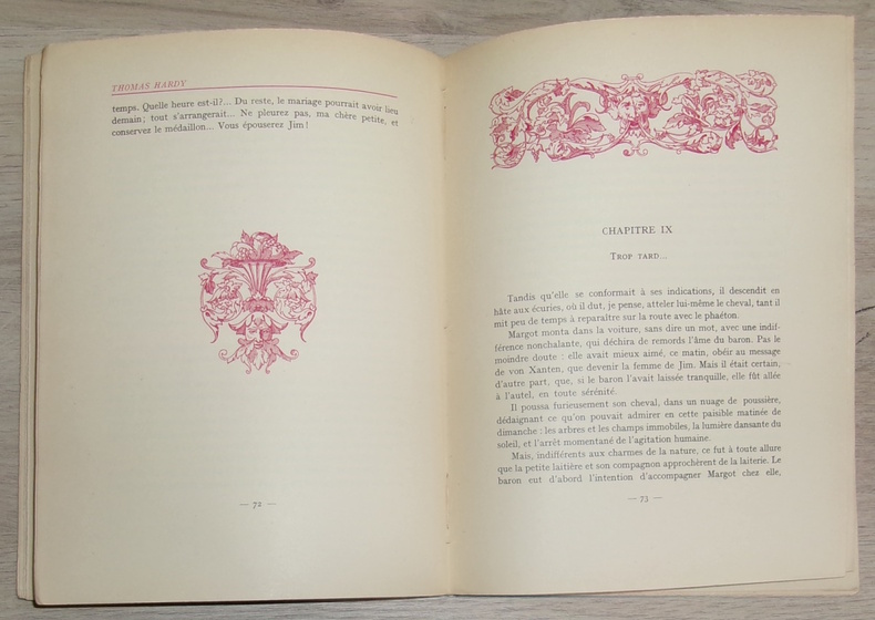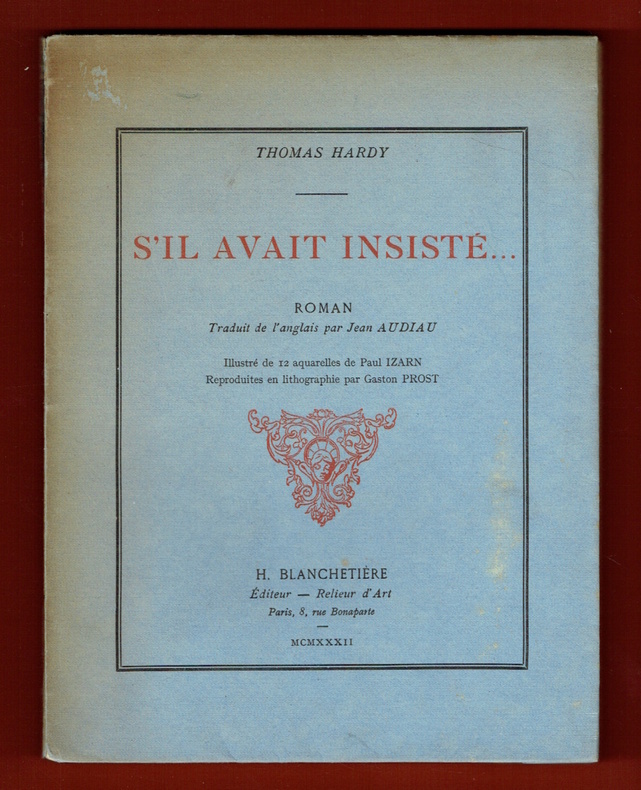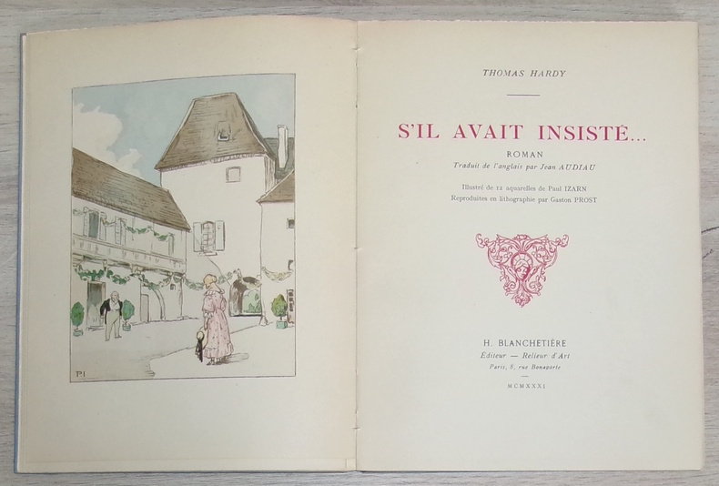 Éditeur, relieur d’Art H. Blanchetière, 1932. Exemplaire numéroté sur papier vélin pur fil des papeteries du Marais. Roman traduit de l’anglais par Jean Audiau. Livre illustré de 12 aquarelles pleine page de Paul Izarn, reproduites en lithographie par Gaston Prost et de bandeaux et culs de lampe monochromes.