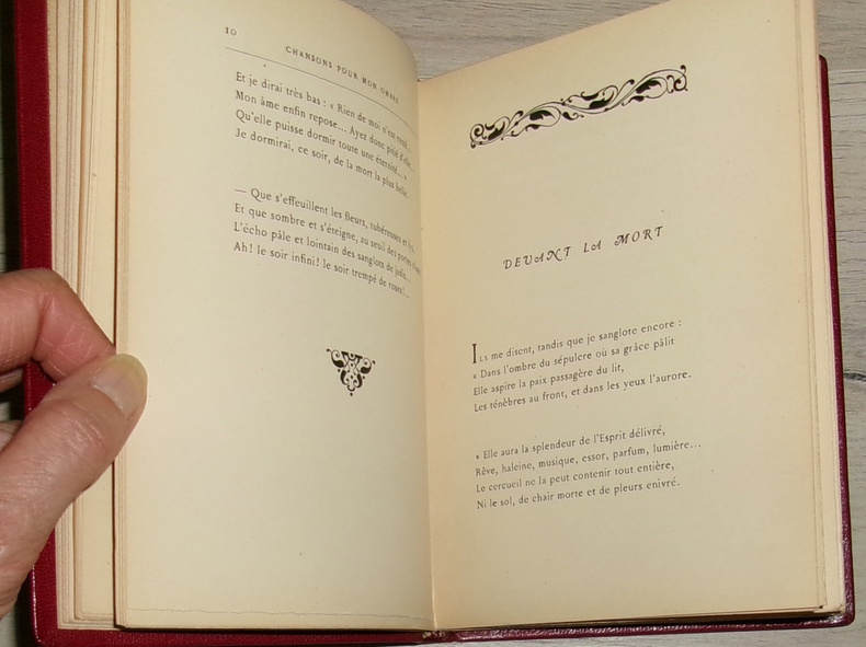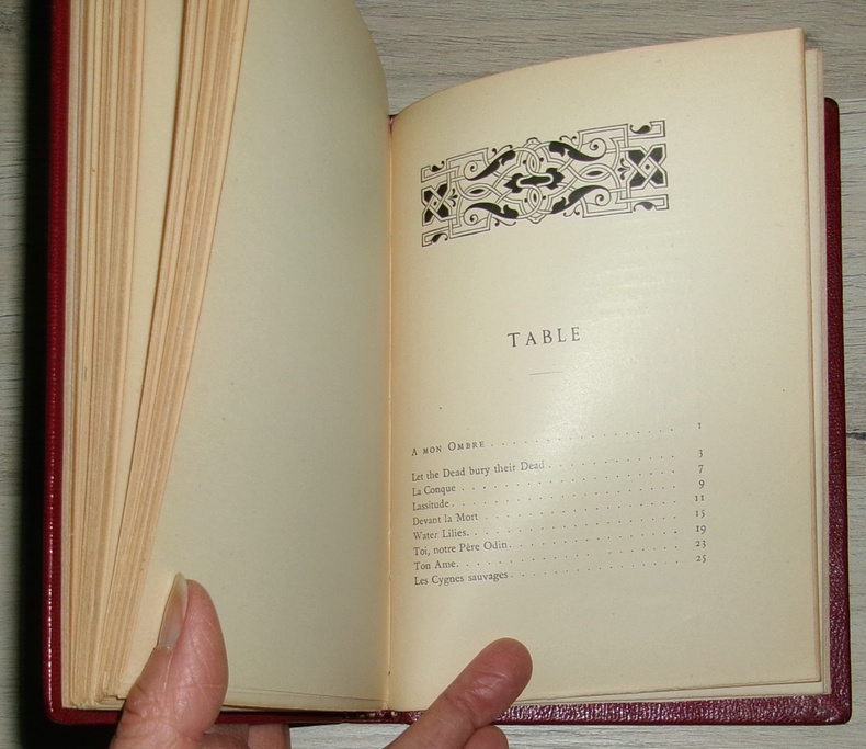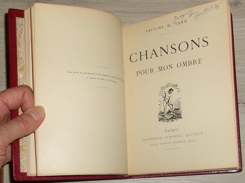 Editions Alphonse Lemerre, 1907. Édition originale de Renée Vivien dont il n'a pas été tiré de grands papiers; seule oeuvre publiée de son vivant sous son véritable nom, Pauline M[ary] Tarn. Reliure plein cuir, dos richement décoré, tête dorée, couverture d’origine conservée. Livre illustré de bandeaux en noir.