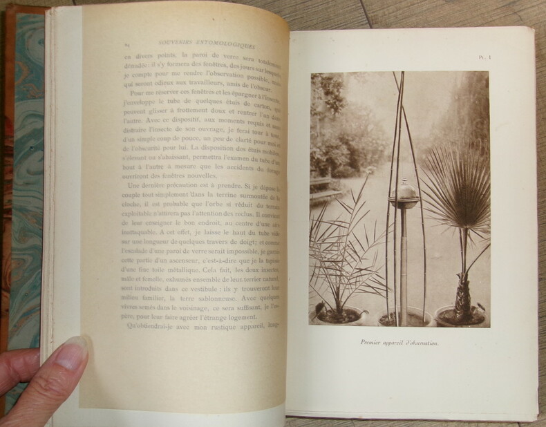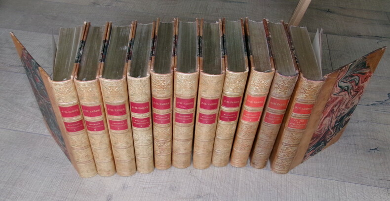Paris Librairie Delagrave, 1923-1924 0 Onze volumes grand in-8° (250 x 165mm), VIII 375 (2), IV 372, II 460, II 360, II 384, II 454, II 426, II 412, II 400, II 428 (1) pp. et XVI 440 pp. Reliures en demi-basane à coins fauve marbré, dos à nerfs richement ornés, pièces d'auteur et de titre chagrinées rouge, caissons à décor doré en forme d'insecte et de fleurs, double filet doré sur les plats, papier marbré sur les plats et sur les gardes, têtes dorées, signets (reliure éditeur). (un dos légèrement usé, plusieurs dos légèrement insolés, présence de quelques petites rousseurs situées sur les gouttières). Édition enrichie de près de 200 planches photographiques (héliogravures), sous serpente, la plupart prises sur le vif. Nombreux dessins dans le texte. Le onzième et dernier volume est " La Vie de Fabre " par le Dr.G.-V. Legros, avec des reproductions de photos dont le portrait de Fabre. In fine, répertoire général analytique. Édition définitive complète de ce monumental classique de la littérature entomologique, qui parut pour la première fois de 1879 à 1907. Fruit d'une vie dédiée à l'étude des comportements des insectes, les Souvenirs entomologiques valurent à leur auteur une considérable notoriété, non seulement pour la qualité scientifique de l'oeuvre, mais également pour son style particulièrement agréable à la lecture (prix Née de l'Académie française en 1910). Année d'achat, signature du possesseur de l'ouvrage et étiquette numéroté en première page blanche sur l'ensemble des volumes. Exemplaire en belle condition en reliure éditeur.