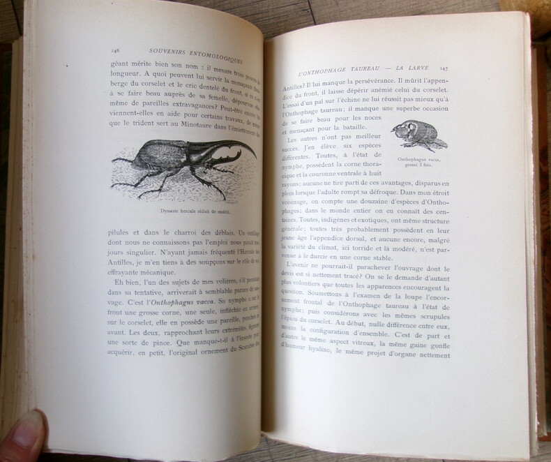Edition définitive complète de ce monumental classique de la littérature entomologique, qui parut pour la première fois de 1879 à 1907. Fruit d'une vie dédiée à l'étude des comportements des insectes, les «Souvenirs entomologiques» valurent à leur auteur une considérable notoriété, non seulement pour la qualité scientifique de l'oeuvre, mais également pour son style particulièrement agréable à la lecture (prix Née de l'Académie française en 1910). Admiré par Darwin qui le qualifiait, en 1859 déjà, d'“observateur inimitable” dans son fameux «Origin of Species», Fabre n'en demeura pas pour autant convaincu, sa vie durant, que les espèces étaient fixes, et non sujettes à une quelconque évolution. Chaque espèce animale est immuable, selon lui, avec le même bagage instinctif et physique qu'à son apparition. Le onzième volume (qui fait souvent défaut à cette série) contient le très utile «Répertoire général analytique des Souvenirs entomologiques» ainsi que la biographie de l'auteur par son gendre, G.-V. Legros.“Fabre devoted himself almost exclusively to the research on biologie and behavior of insects, that was to make him one of the great figures of entomology, in 1859 Charles Darwin cited him in his Origin of Species. Fabre's ten-volume (here present with the often missing 11th volume, by G.-V. Legros «La Vie de J.-H. Fabre» followed by «Répertoire général analytique des souvenirs entomologiques»), which presents a considerable number of original observations on the behavior of insects (and also of arachnids).” (DSB). Dictionary of Scientific Biography IV/503; Bibliothèque Nationale (1990), «En français dans le texte» n° 308. image disp.