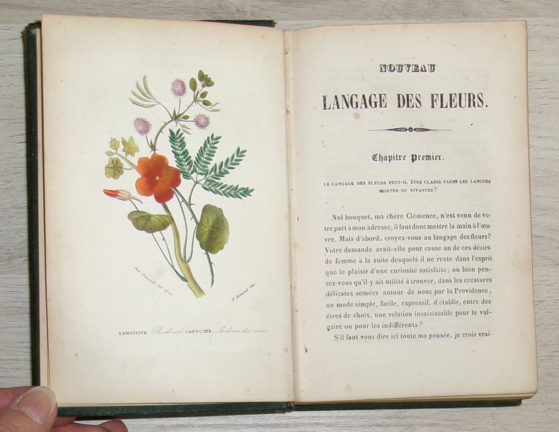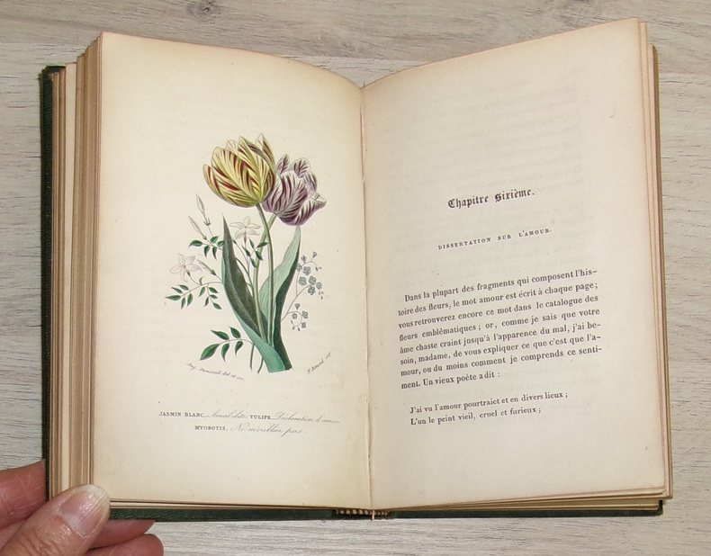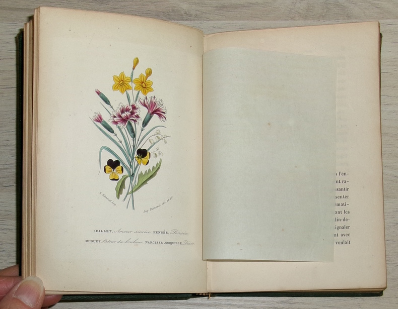 Editions Neuhaus et Joeph Loss, 1841. Livre illustré de 11 planches en couleurs rehaussées (sensitive, chèvrefeuille, oeillet, acacia, jasmin, …) et une page de titre en noir. Reliure cartonnage romantique décoré en couleurs, 3 tranches dorées. Histoire et poétique des fleurs, principes fondamentaux, syntaxe du langage des fleurs, dissertation sur l’amour, dictionnaire des plantes symboliques, etc.