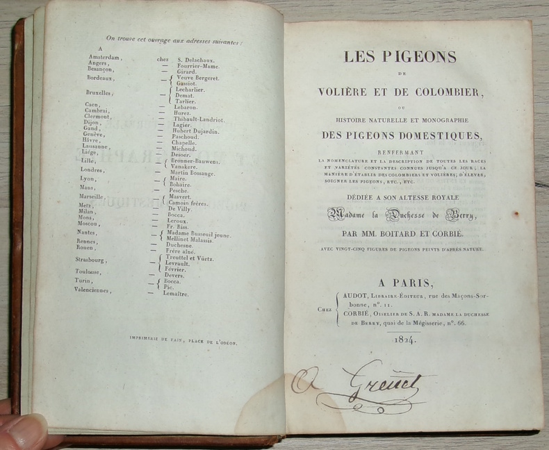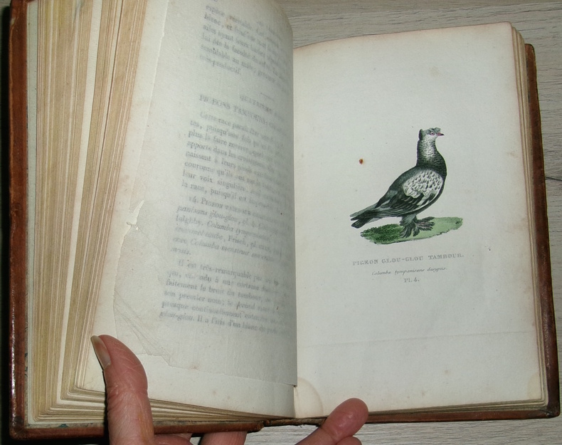 Editions Audot, Corbié, 1924. Histoire naturelle et monographie des pigeons domestiques renfermant la nomenclature et la description de toutes les races et variétés constantes connues jusqu’à ce jour, la manière d’établir des colombiers et volières, d’élever, soigner les pigeons, etc. dédiée à son Altesse Royale la Duchesse de Berry. Livre illustré de 25 figures de pigeons peints en couleurs d’après nature.