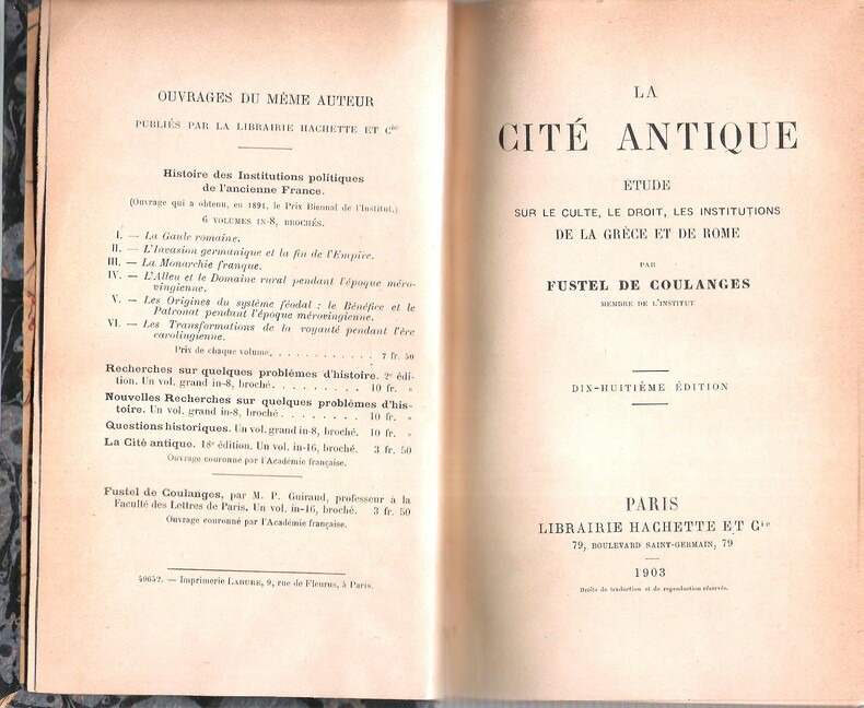 Paris Hachette 1903 in-16° Demi-reliure en cuir bleu marine à 4 nerfs . Reste important pour avoir démontré le rôle essentiel des religions dans la constitution des civilisations . Légèrement frotté en cartonnage . Histoire Antiquité - 480 p. , 700 gr.