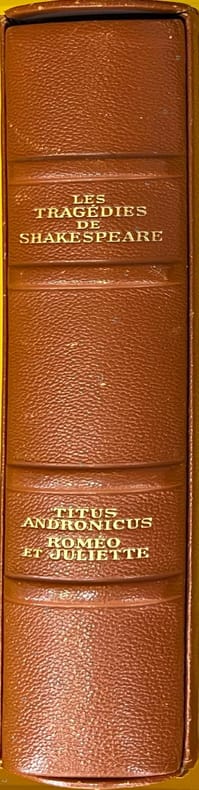 Numbered edition. This set is one of the copies on Vélin chiffon de Rives. Total limitation of 2950 copies. This edition encompasses 10 tragedies across six volumes, richly decorated with colour illustrations hors texte, and highly regarded for their artistic quality. Translated from English by François Victor-Hugo. Illustrated by a distinguished group of French artists, each contributing to different volumes. Uniformly bound in red leather, each with a dark grey cardboard slipcase with red and gold, black and gilt marbled decoration. These are: - Othello, illustrations by Léonor Fini: 222 pages with an additional original engraving by Léonor Fini. -Coriolan / Timon d'Athènes, illustrations by Yves Brayer, 324 pages - Roméo et Juliette / Titus Andronicus, illustrations by Jean-Denis Malclès: 292 pages - Jules César / Le Roi Lear, illustrations by Georges Wakhévitch, 326 pages - Hamlet, illustrations by Carzou, 209 pages - Macbeth / Antoine et Cléopâtre, illustrations by Douking, 320 pages. In excellent condition. 26cm x 21cm/ .
