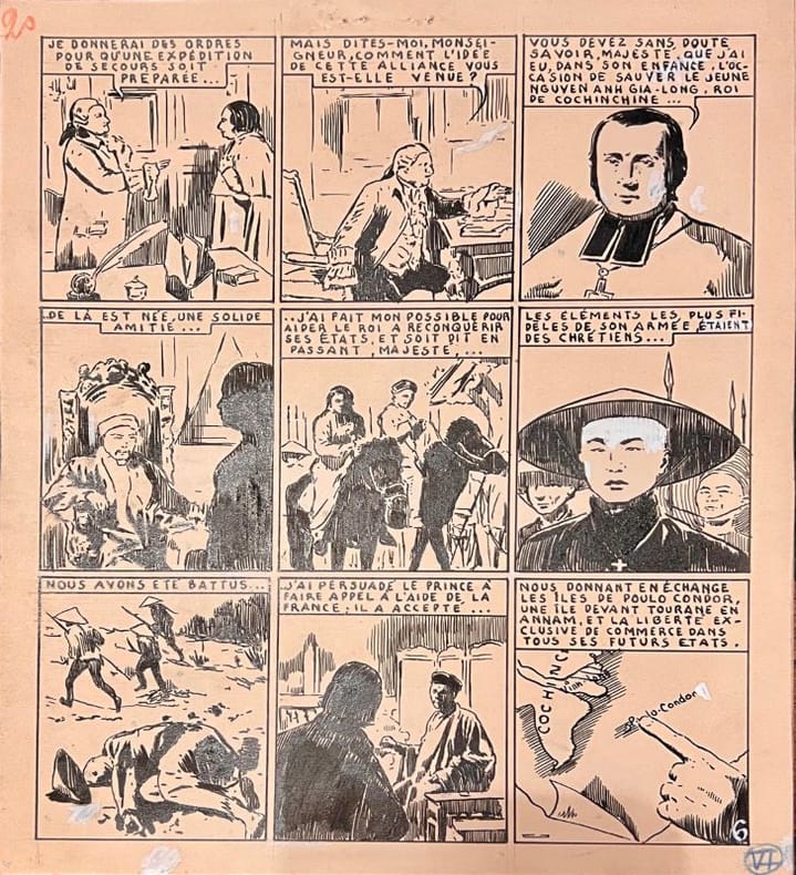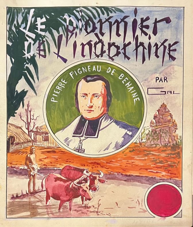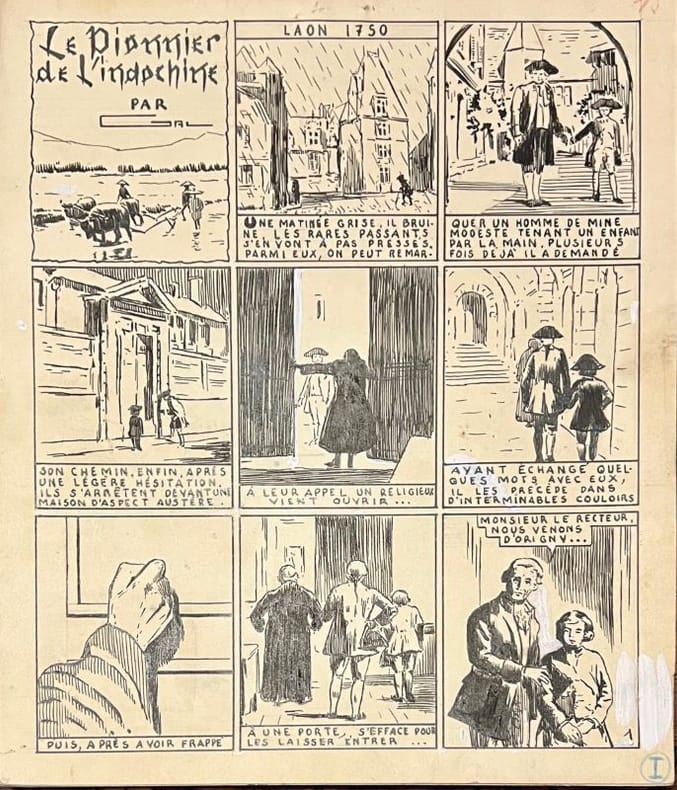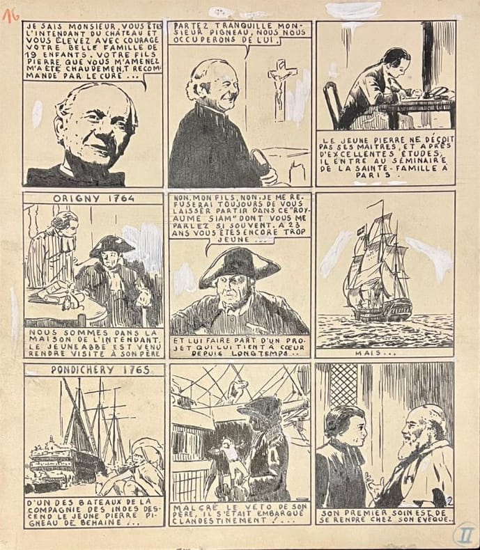 Dans les années 50, les kiosques à journaux de la Francophonie furent envahis de comics en français et en noir et blanc. Le principal responsable : ARTIMA, pour ARTisans en IMAgerie (sigle choisi parce que les Allemands ne permettaient de fonder d'entreprises autres qu'artisanales). Nous présentons la maquette originale composée de la couverture et des planches, ainsi que les feuillets imprimés correspondants. Quelques petites taches et salissures sur les planches. Histoire complète, en 9 planches, sur l'Évêque Pierre Pigneau de Béhaine dans la péninsule Indochinoise, "Première pierre de l'oeuvre française en Extrême Orient" sous le règne de Louis XVI. Édition pour la jeunesse.