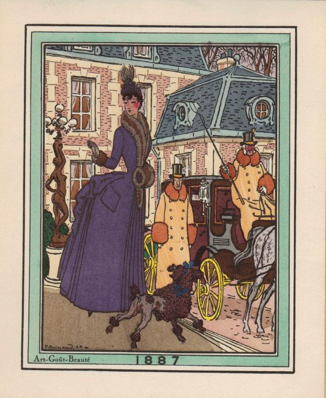 Pochoir pour la revue Art Goût Beauté. Une femme sort de sa maison et s'apprête à monter dans son fiacre. Elle est vêtue d'une robe manteau violette, d'un col de fourrure et d'un manchon. Une maison cossue et un caniche complètent la scène.