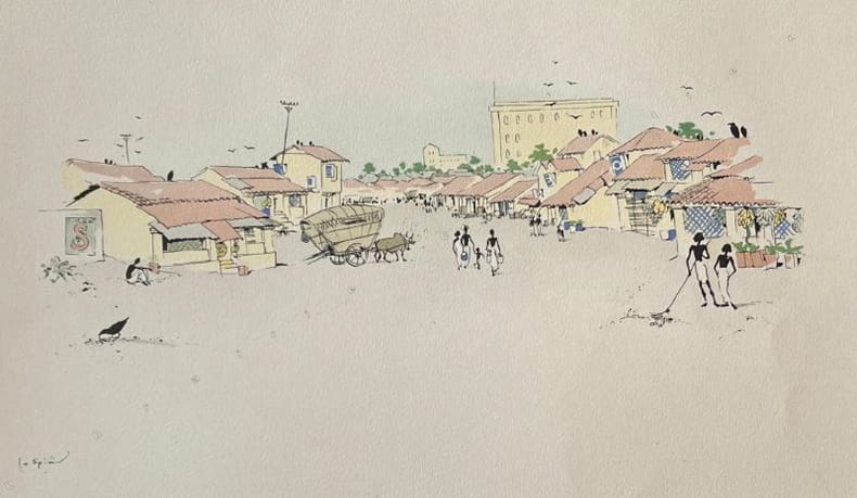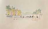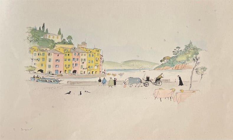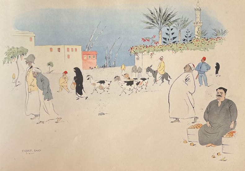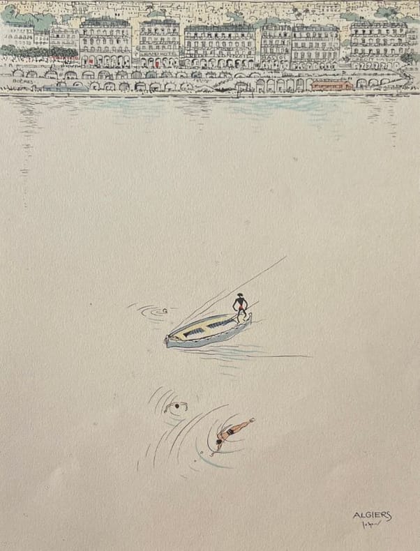 Recueil publicitaire pour la Nederland Line, composé d'aquarelles pleines de poésie sur le thème du voyage. Jo Spiel saisit des instants et des scènes, croquées avec charme et drôlerie, pendant cette traversée de l'Italie jusqu'en Extrême Orient en passant par le Moyen-Orient et l'Afrique. Couverture salie, jaunie, dos déchiré dans la partie inférieure, coin inférieur de la couverture plié.