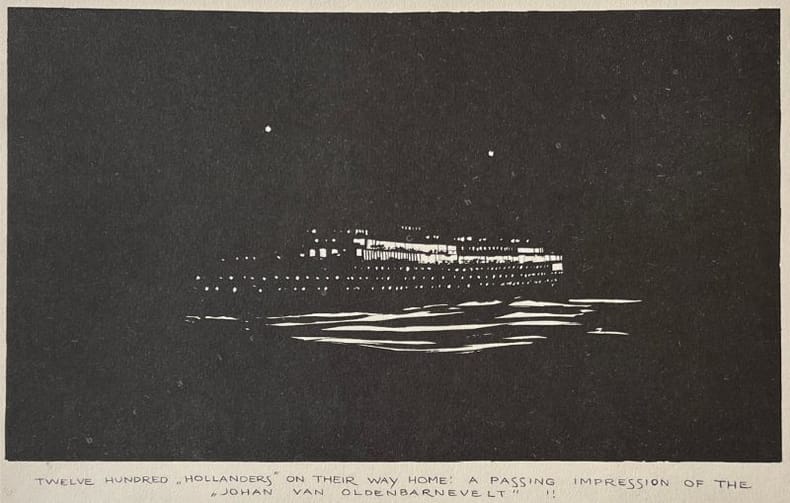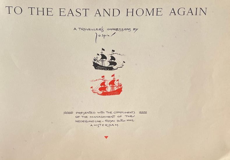 A traveller's impression by Jo SPIEL. Amsterdam, The Management of the nederland line, Royal Dutch Mail, sans date, in-4 à l'italienne broché, couverture imprimée en couleurs, au motif de vagues, titre en rouge sur la couverture, non paginé.